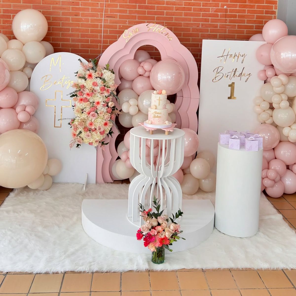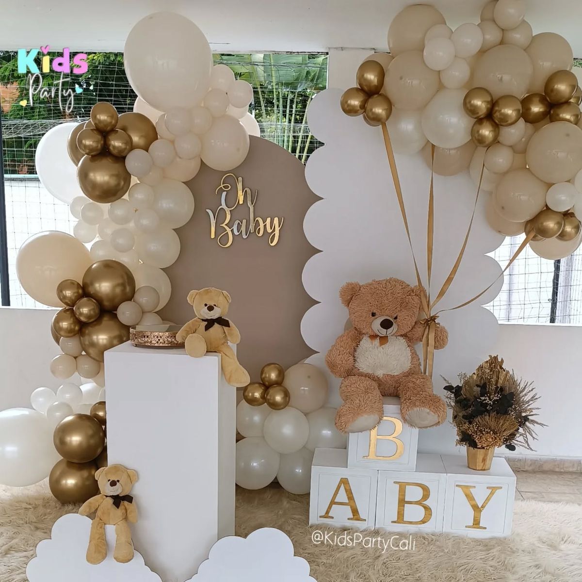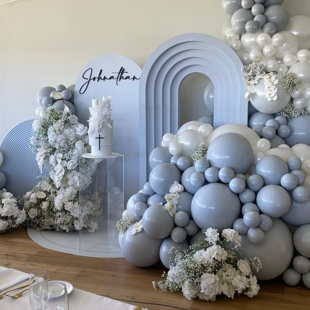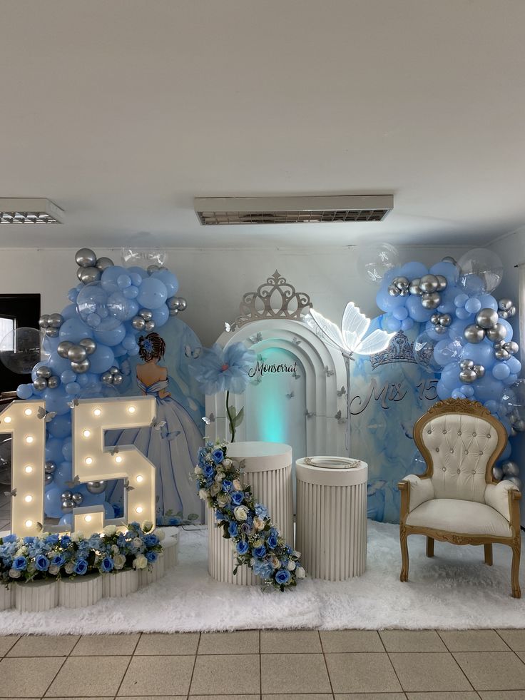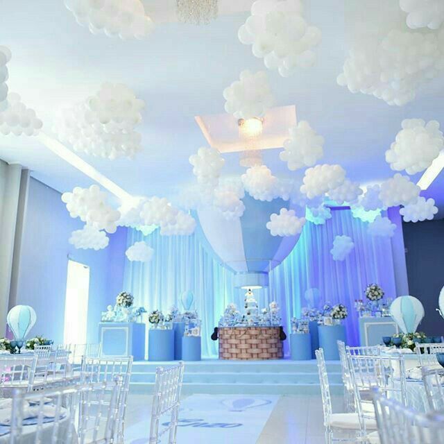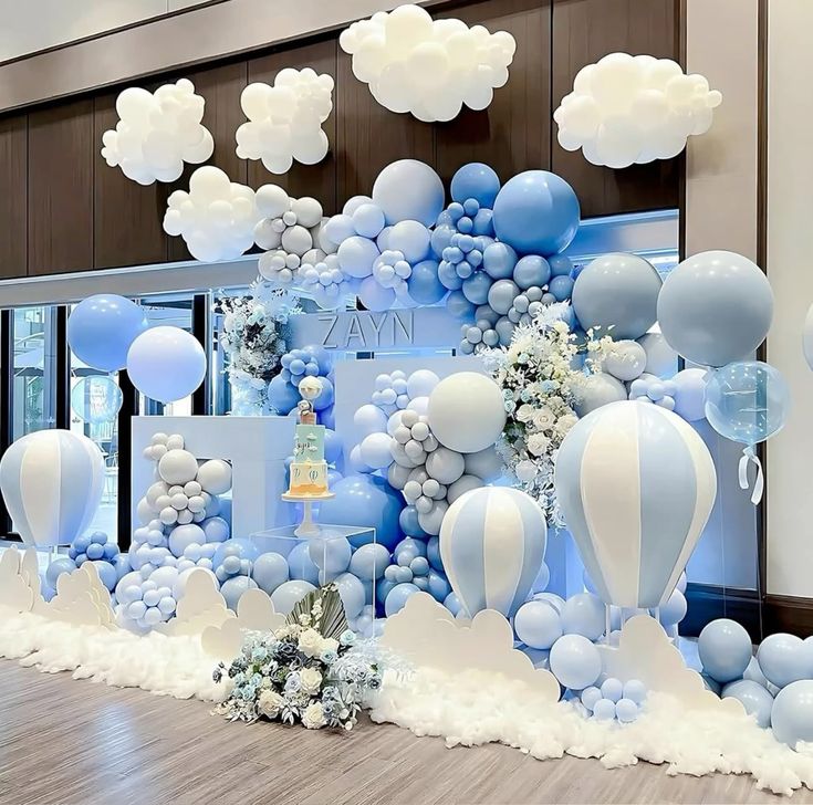 Fondo con globos y detalles en tonos azul, blanco y dorado.