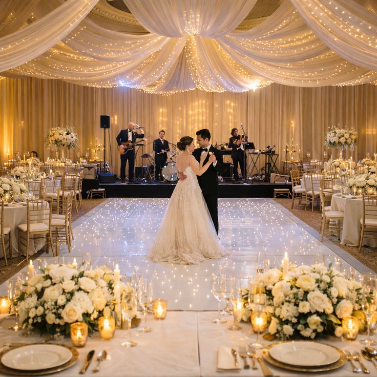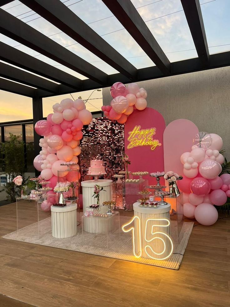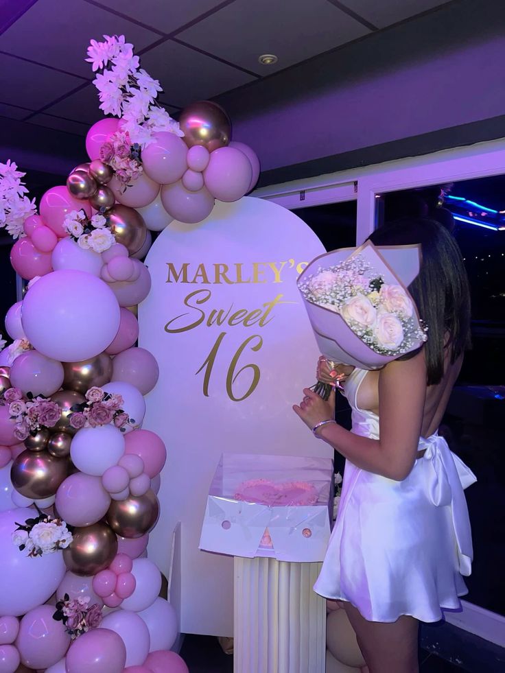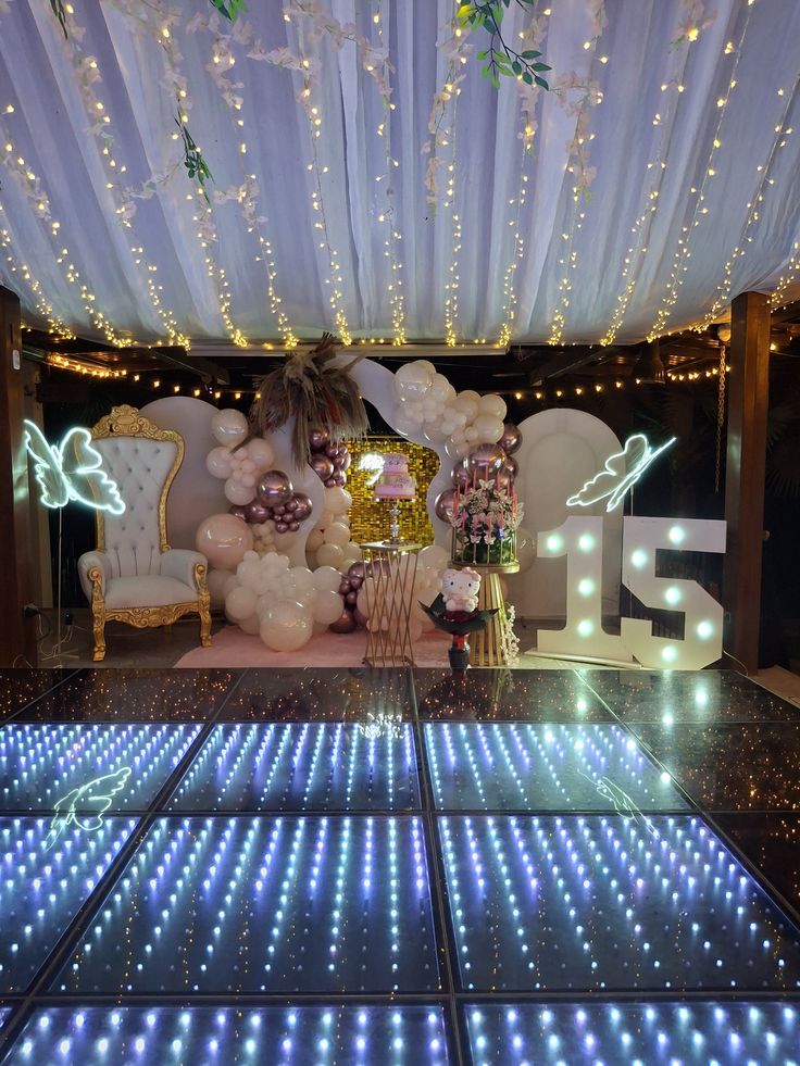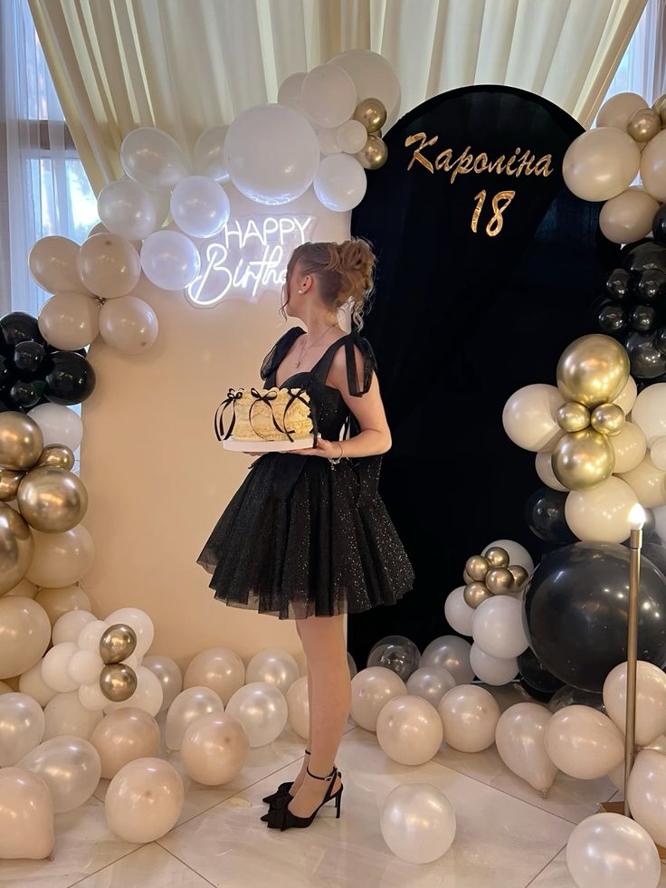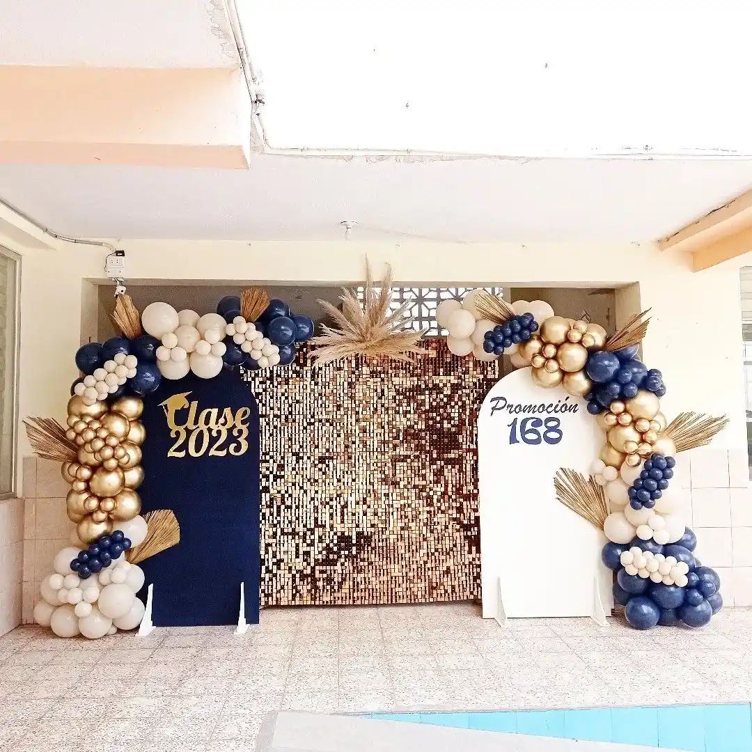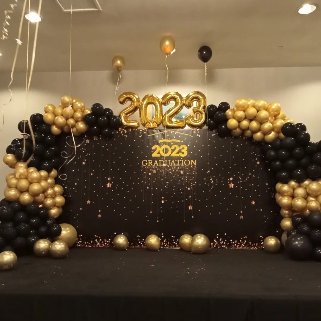 Decoración elegante en negro y dorado para ceremonia de graduación.
